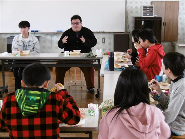 給食を食べながら、子どもたちからいろいろな質問がでました。それに丁寧に答えていただき、白ねぎについての豆知識などをたくさん教えていただきました。