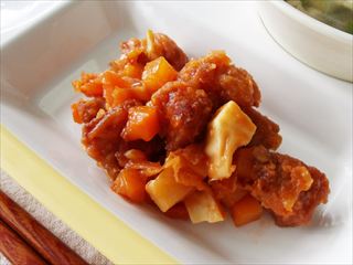 米子市の特産品で、ビタミン豊富なさつまいもやにんじんに、鳥取名物の豆腐竹輪を組み合わせ、ごまの風味豊かなポテトサラダを考えてくれました。