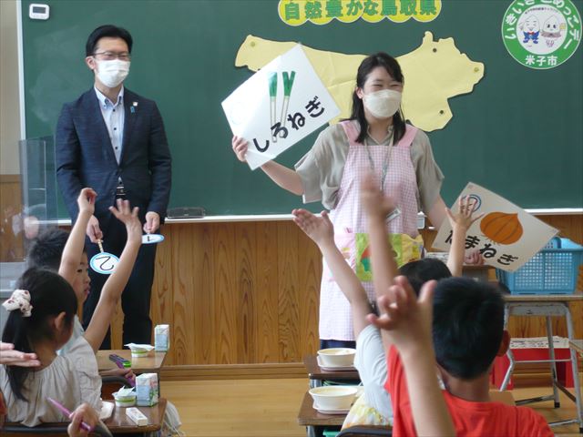 米子市学校給食キャラクター「こめ太・こめ子」が登場。クイズ形式で楽しみながら、自然豊かな米子市のおいしい「味」を学びました。