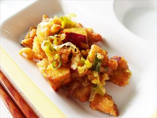 揚げた鶏肉と米子市産さつまいも「浜かんしょ」に、鳥取県の特産品として有名な「白ねぎ」「梨」「らっきょう」を絶妙なバランスで配合した甘辛いソースがからまり、鳥取県の魅力満載の一品です。