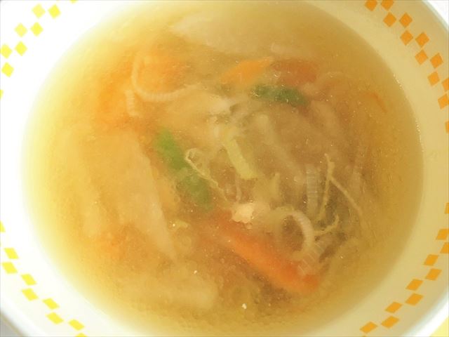 米子の白ねぎや鳥取県内の有名な食べ物を組み合わせたコンソメスープです。たくさんの野菜に鶏肉も入れて栄養バランスがよくなるように考えてくれました。白ねぎがくたくたに煮込まれて、白ねぎの甘みがしみだし、ほっこりと体が温かくなるスープでした。