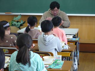 この後は、各クラスで児童たちと一緒に給食を食べました。生産者を囲んで楽しい給食時間となりました。
