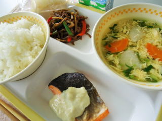先生のお話をしっかりと聴きながら地元の食材たっぷりの給食を味わいました。