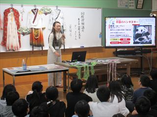 この日、ドンさん が車尾小学校を訪問し、5年生に国際理解講座を行い、中国と日本の食文化の違いや友好都市である保定市について紹介しました。中国に関するクイズも交えられ、子どもたちは楽しく中国文化を学びました。