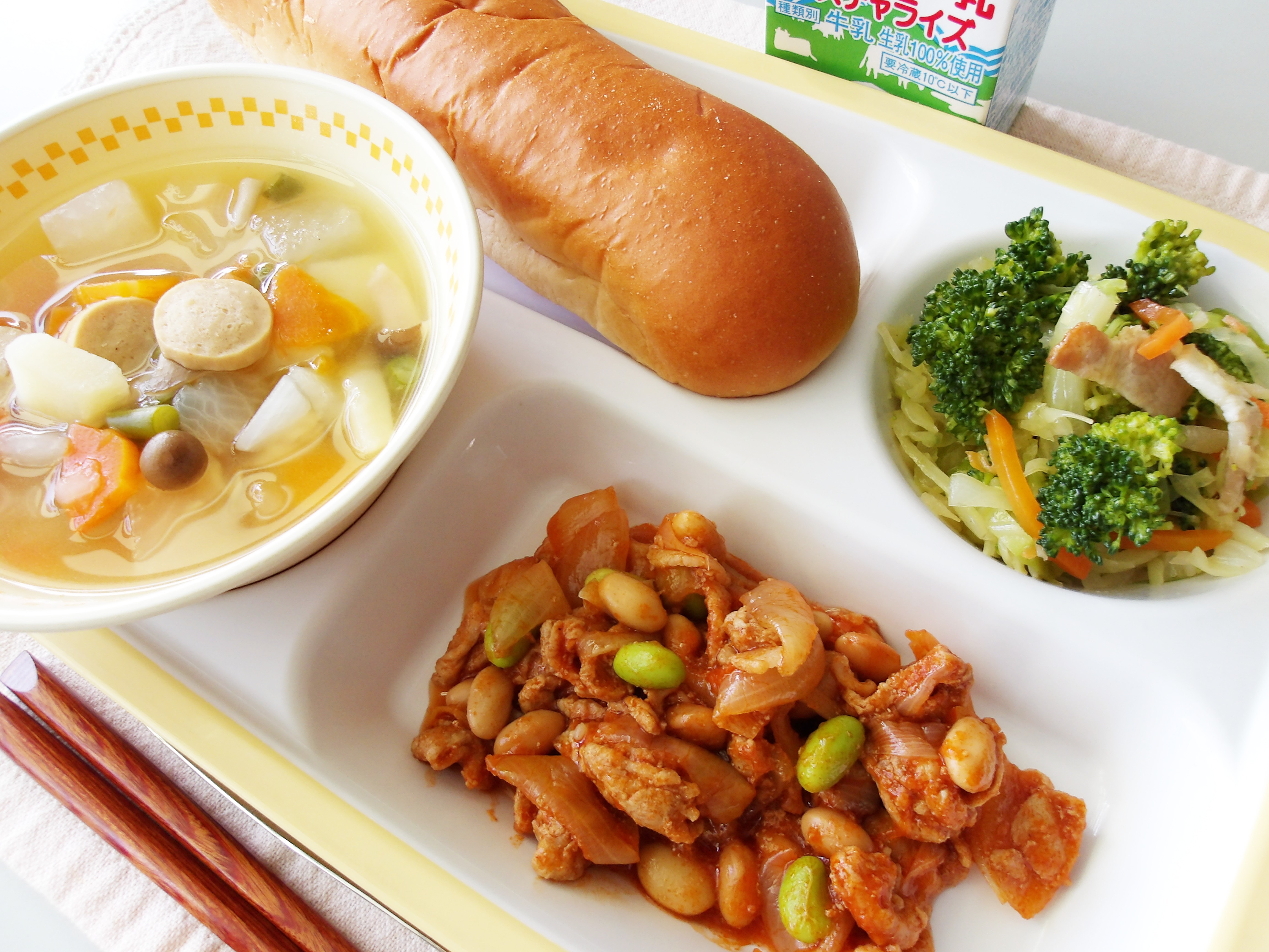 成実小学校5年生 黒川 陽菜さん、野坂 咲來さん、高田 華那さん、福生西小学校6年生 長木 圭佑さんが考えてくれた料理です。