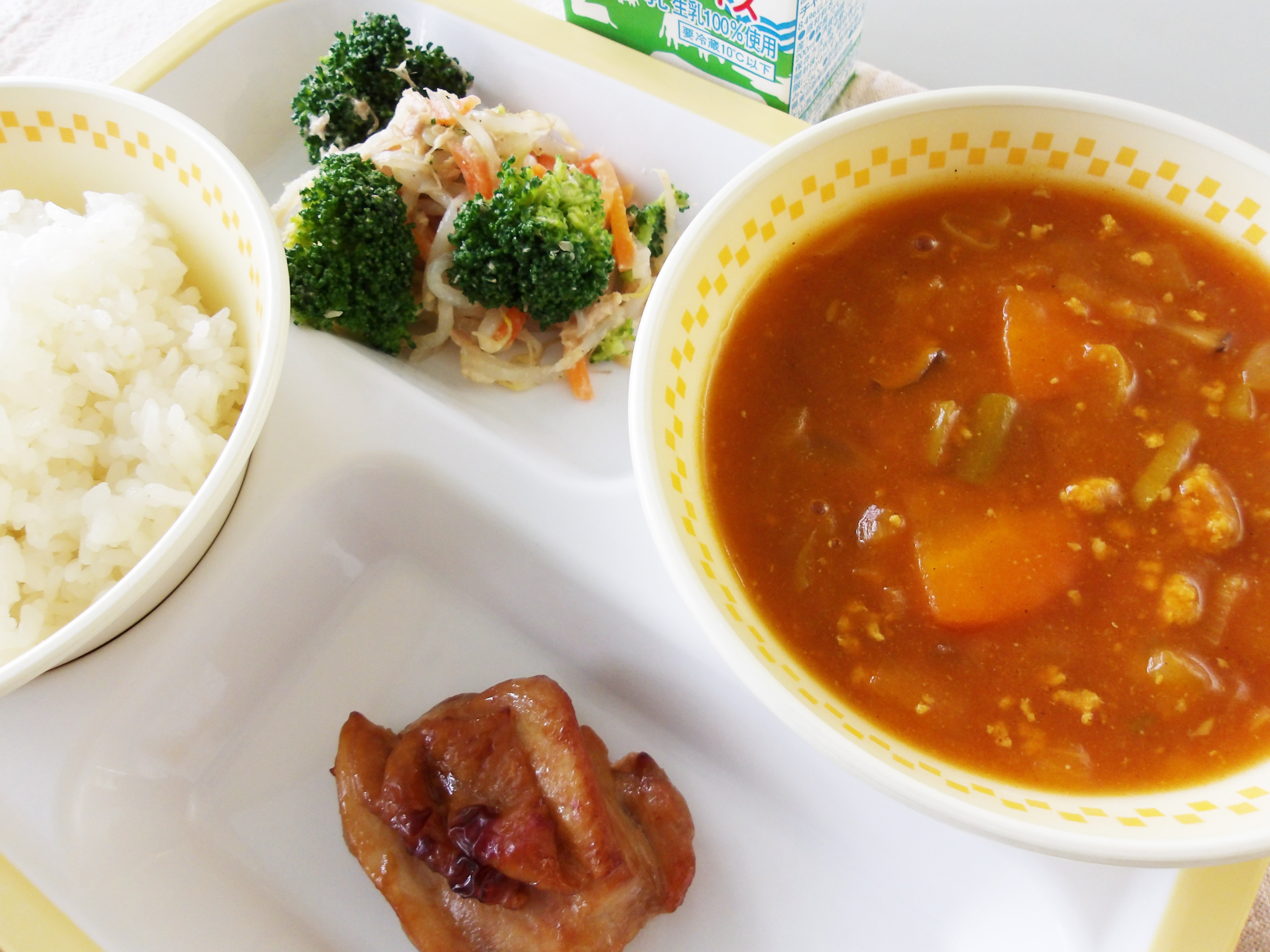 今日のフレ飯カレーには、体をつくるもとになるサバや豚肉や大豆を使っています。