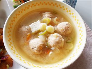 「白ねぎ」「にんじん」「豆腐」などふるさとの食材を、サーモンのつみれ団子のうまみと一緒においしく味わえるように、また、栄養もたっぷりとれるように考えてくれました。アイデア抜群の料理です。