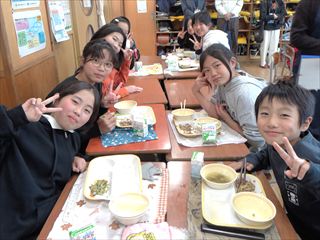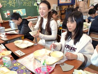 講座の後は、5年2組でドンさんと一緒に給食を食べ交流し、給食を通じて中国文化に触れ国際理解を深める機会となりました。