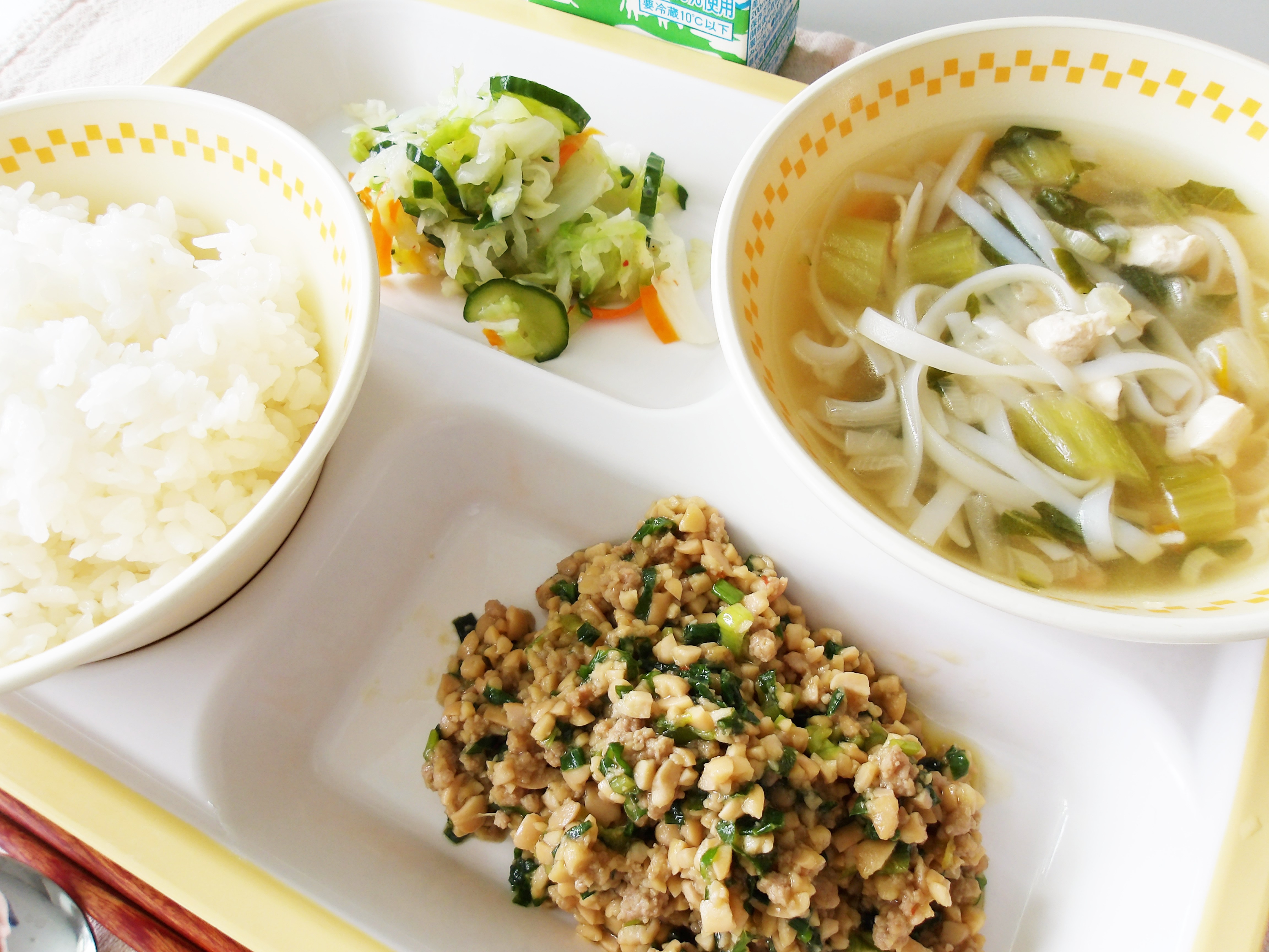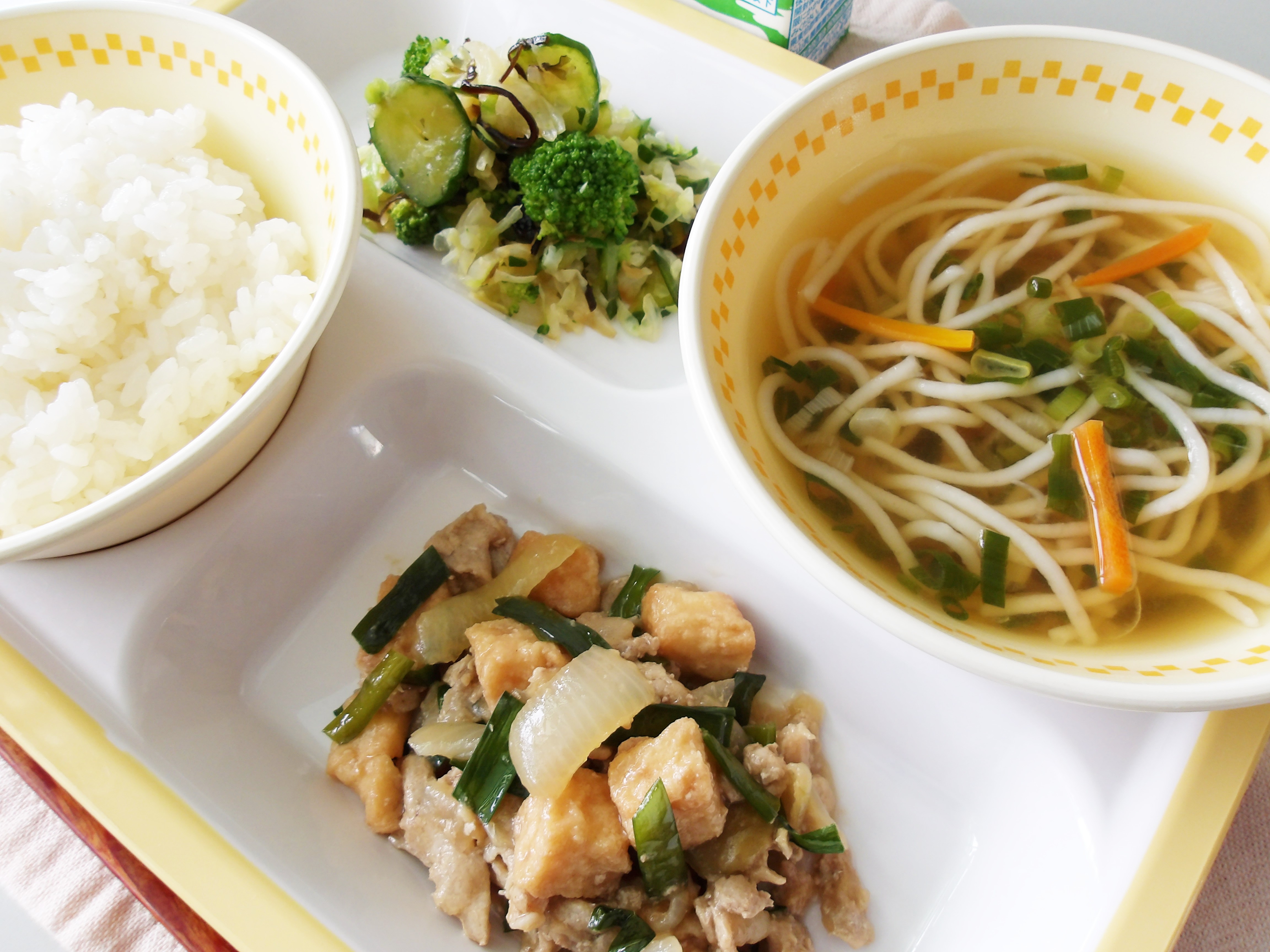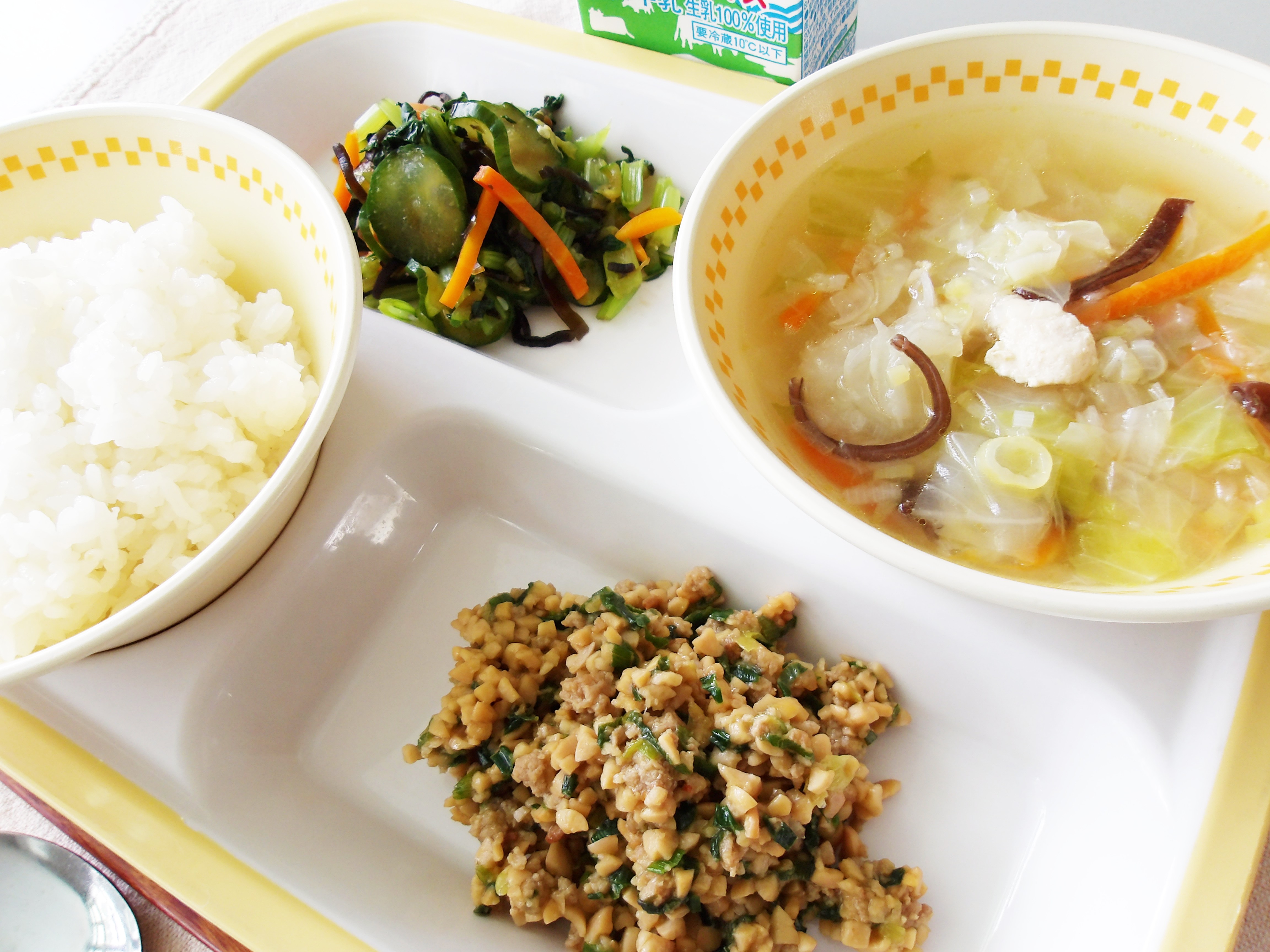 にらの元気パワーで、午後の学習も元気に取り組める栄養満点のスープです。 -