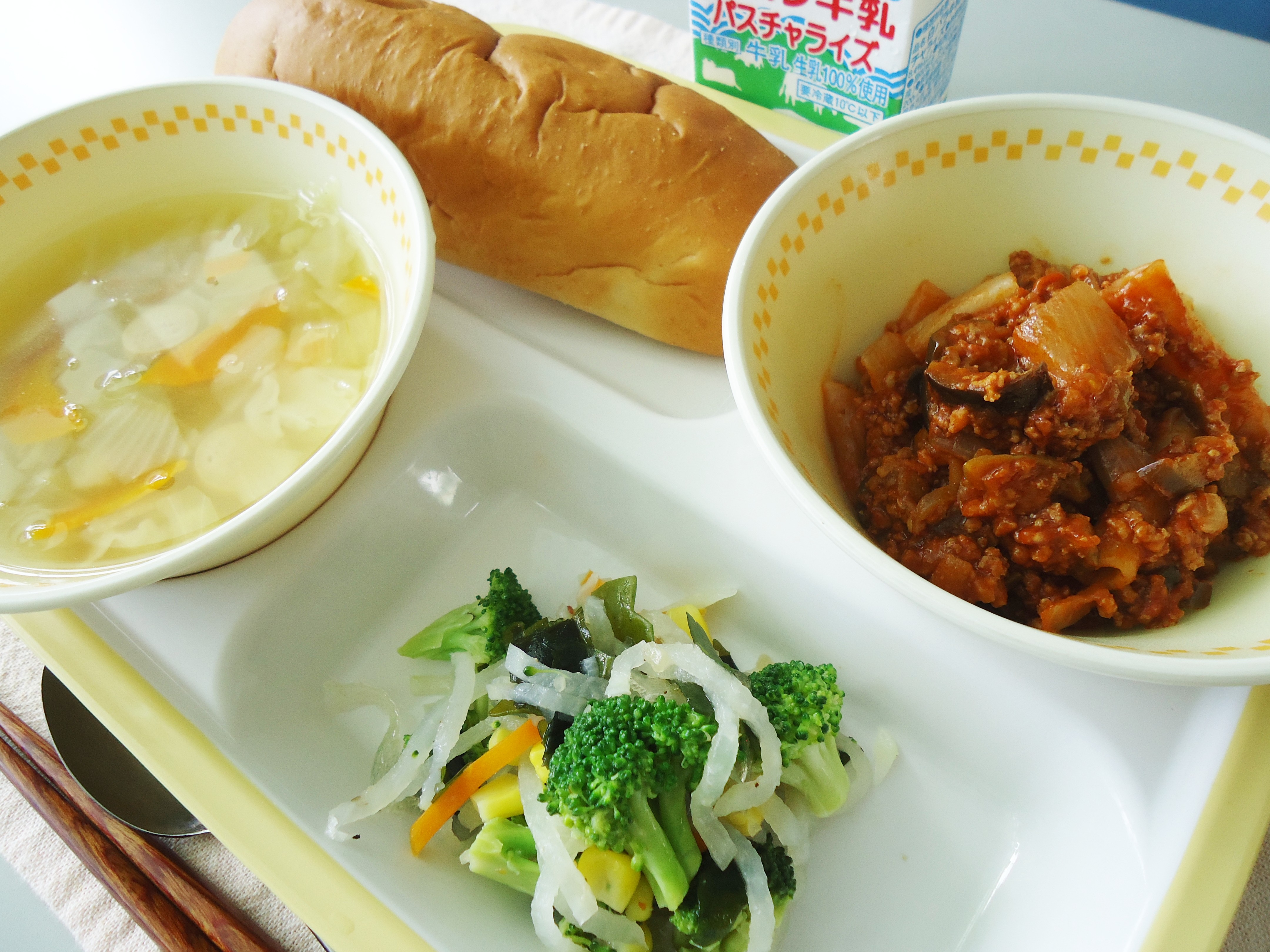 今日のミートソースは、なすと相性のいいトマトとひき肉が炒め合わせてあり、食べやすい味になっています。