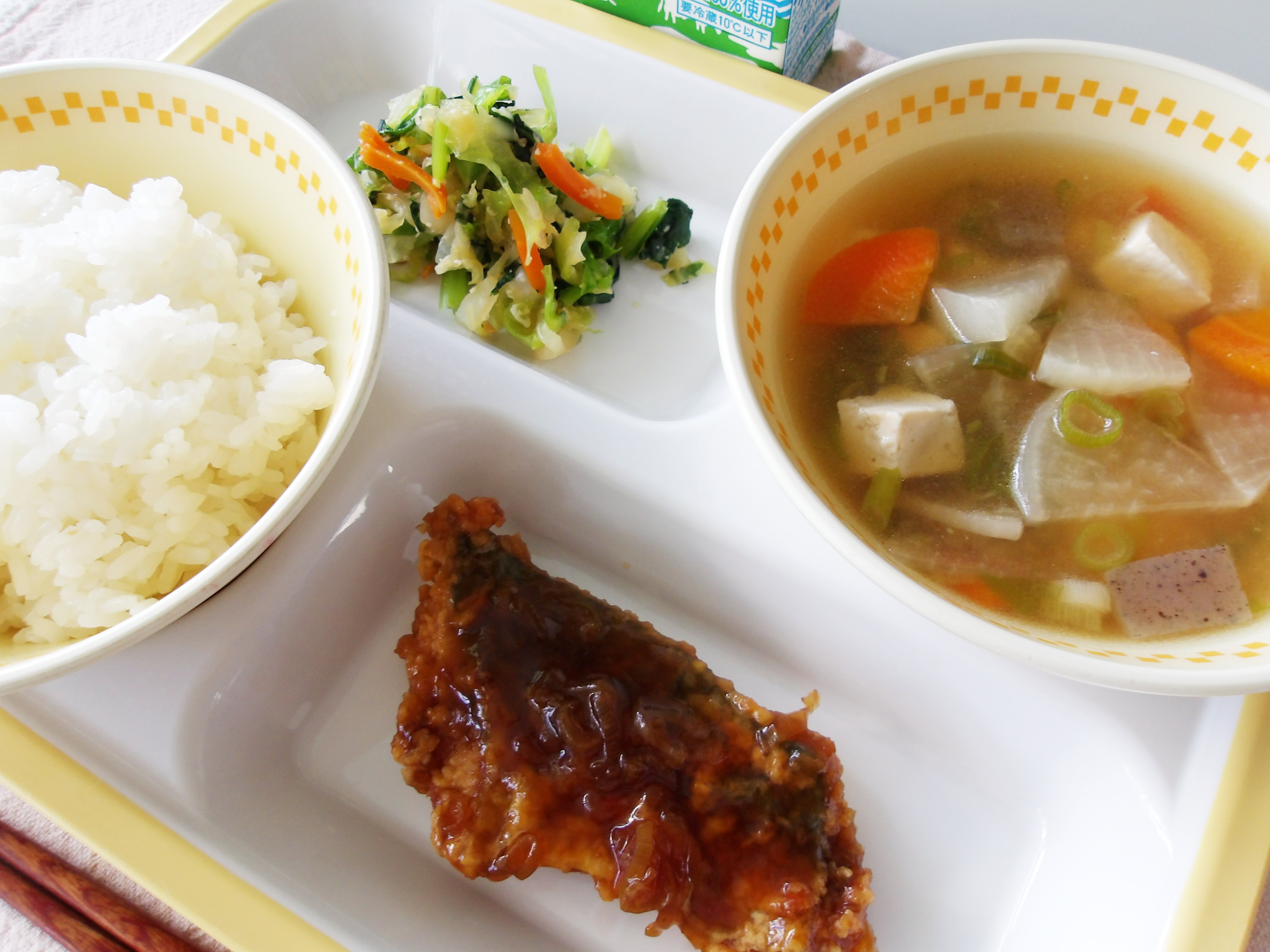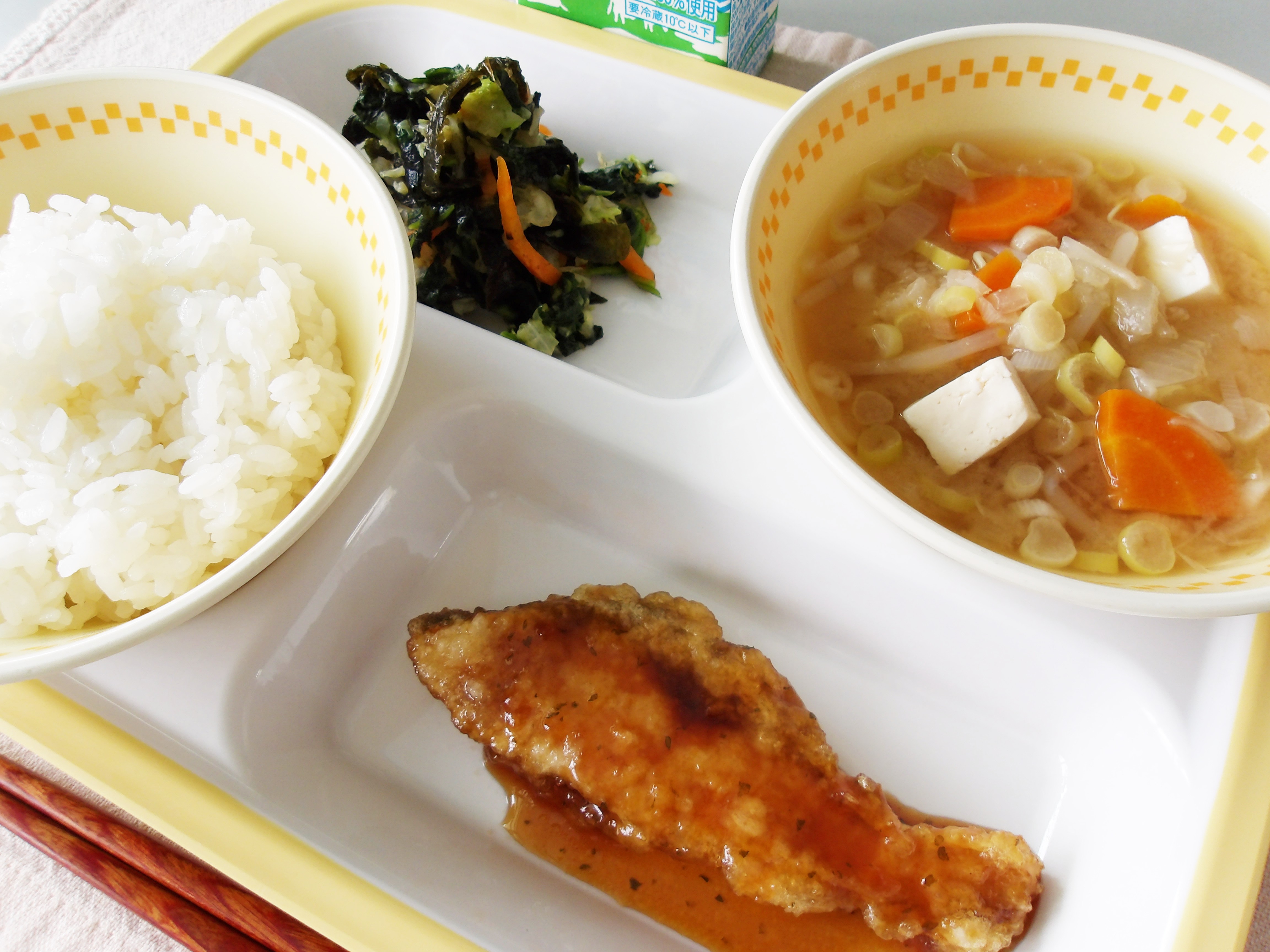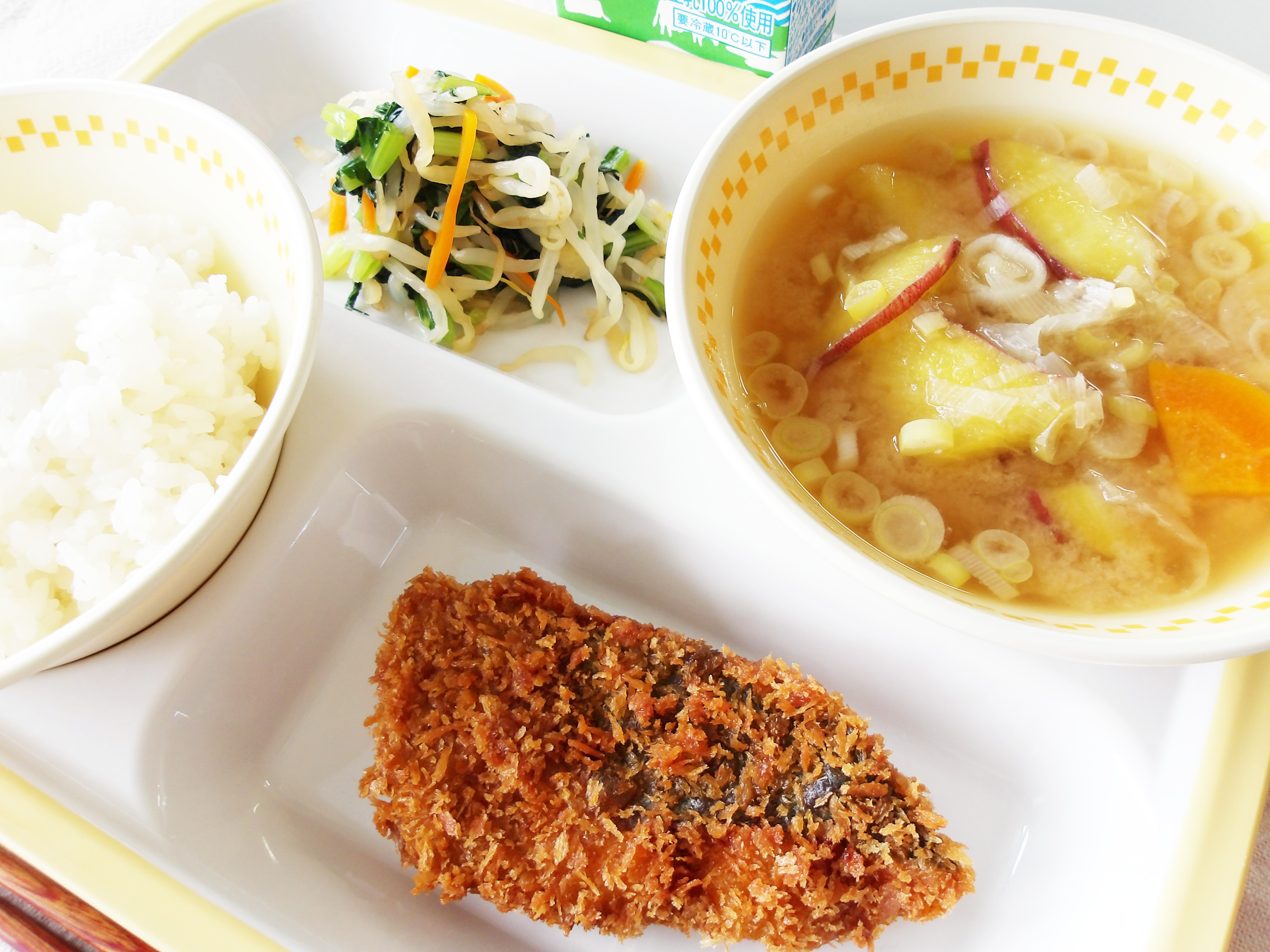 今日の給食の「あじフライ」は、衣はサクッと、身はふんわり揚げてあります。
