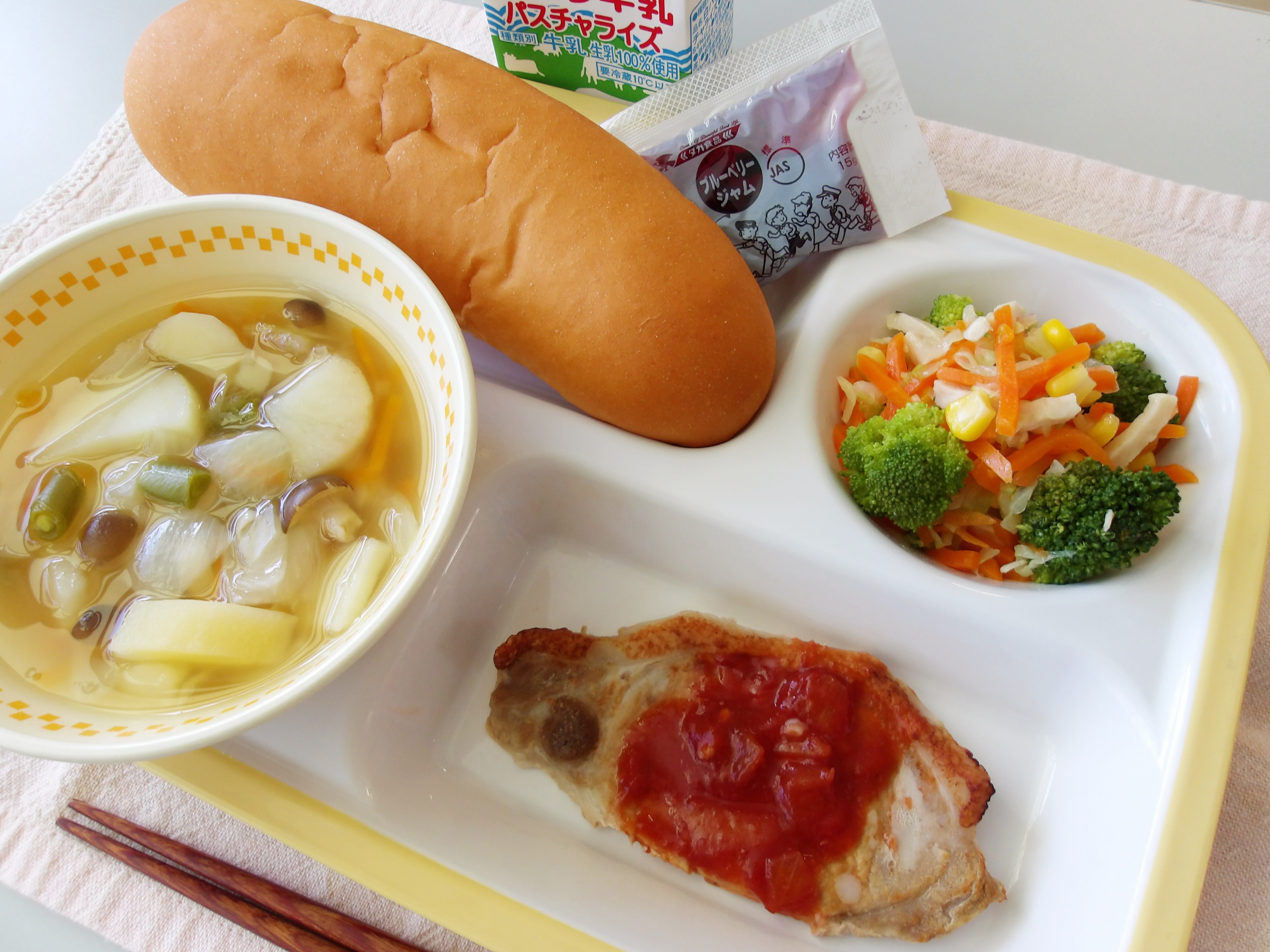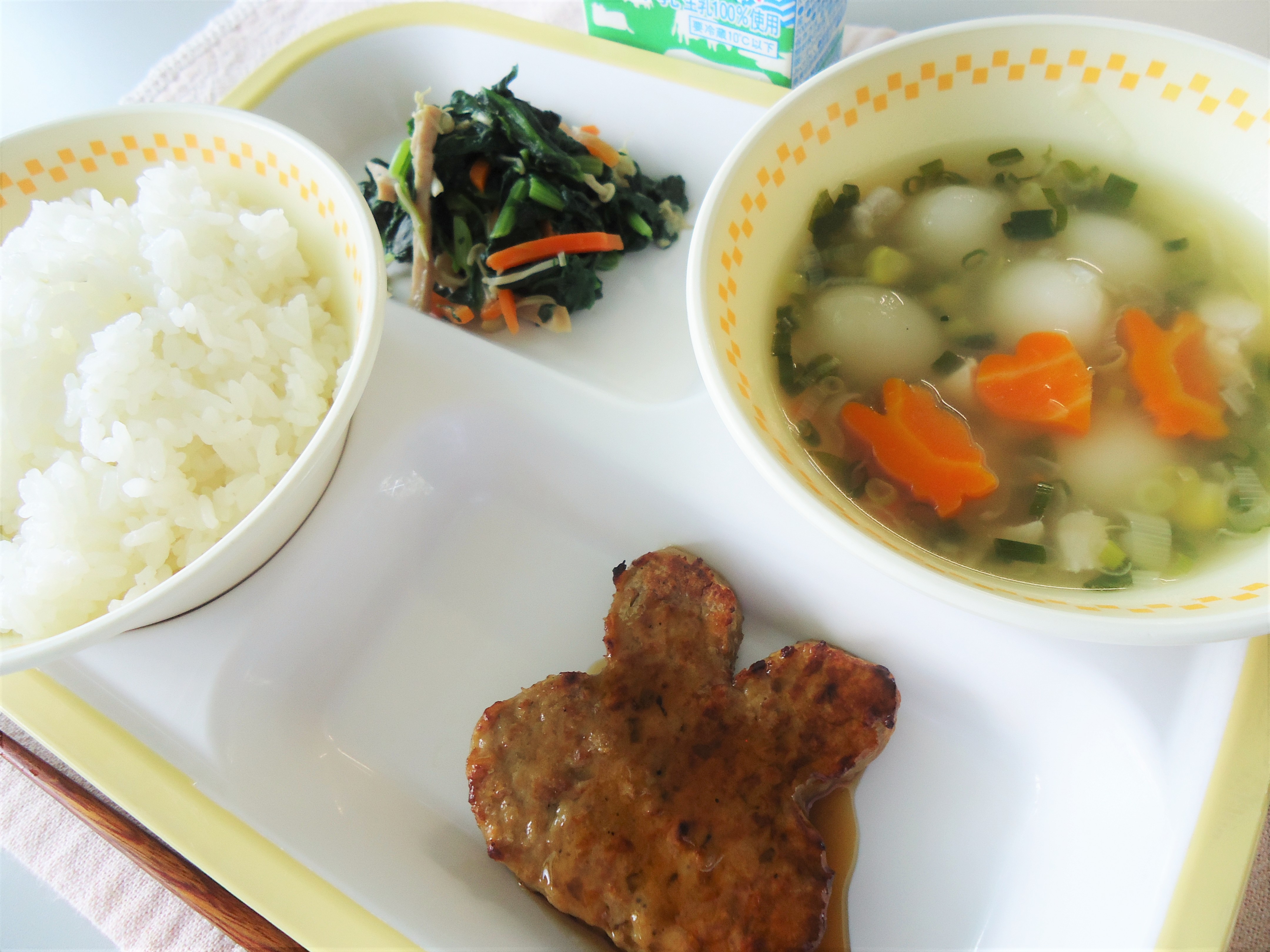 そこで今日の献立は、月のうさぎをイメージした「うさぎ型ハンバーグ」と、満月のような丸い「いももち」が入った「お月見スープ」です。