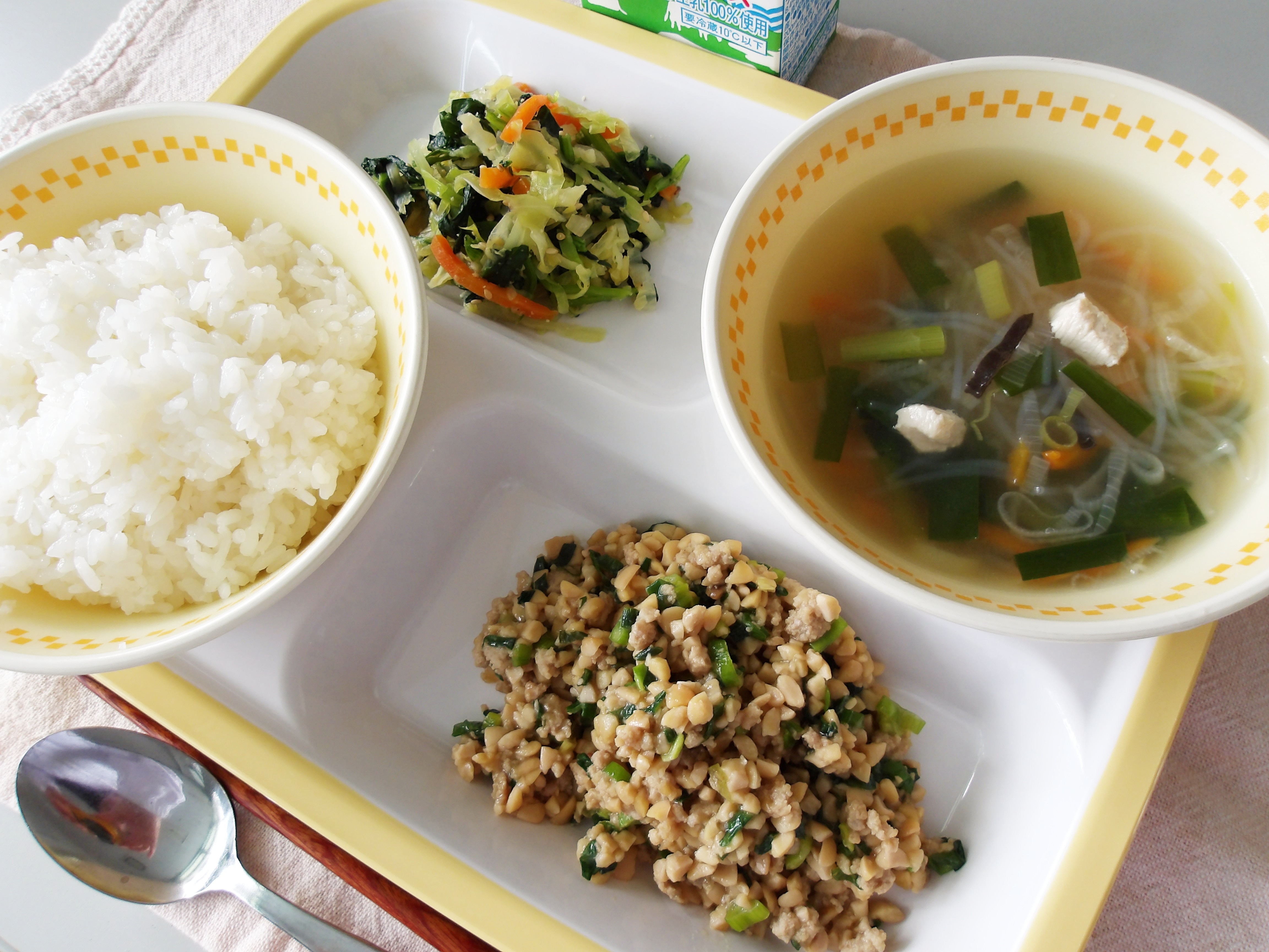 今年度最初の給食は、おいしくて栄養たっぷりの「スタミナ納豆」です。