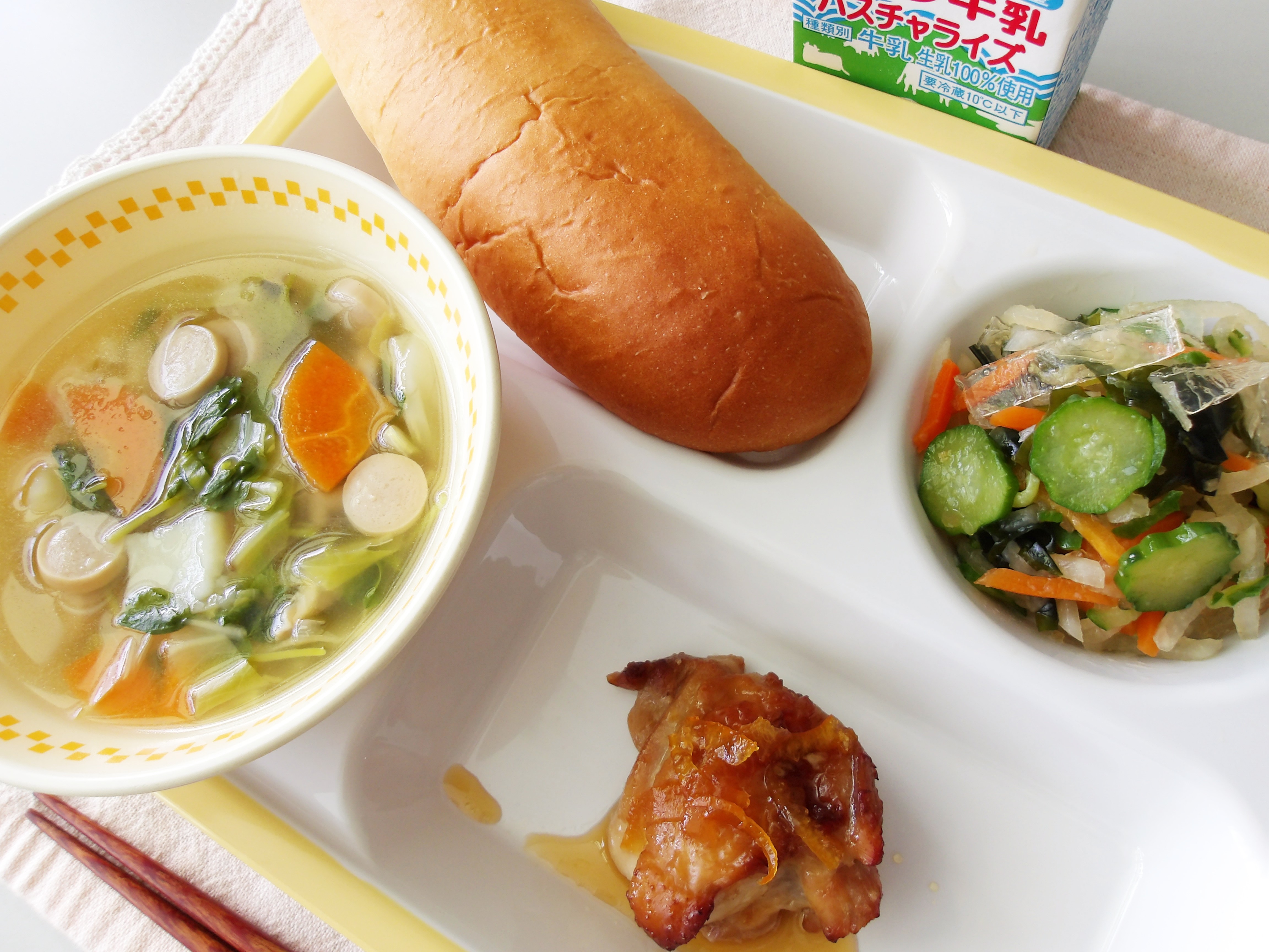 鳥取の食材をよりおいしく、みんなに食べてもらいたいと、みんなが大好きな鶏肉のから揚げを南蛮だれの味付けにして、地元の野菜をたくさん入れて栄養満点になるように工夫してくれました。