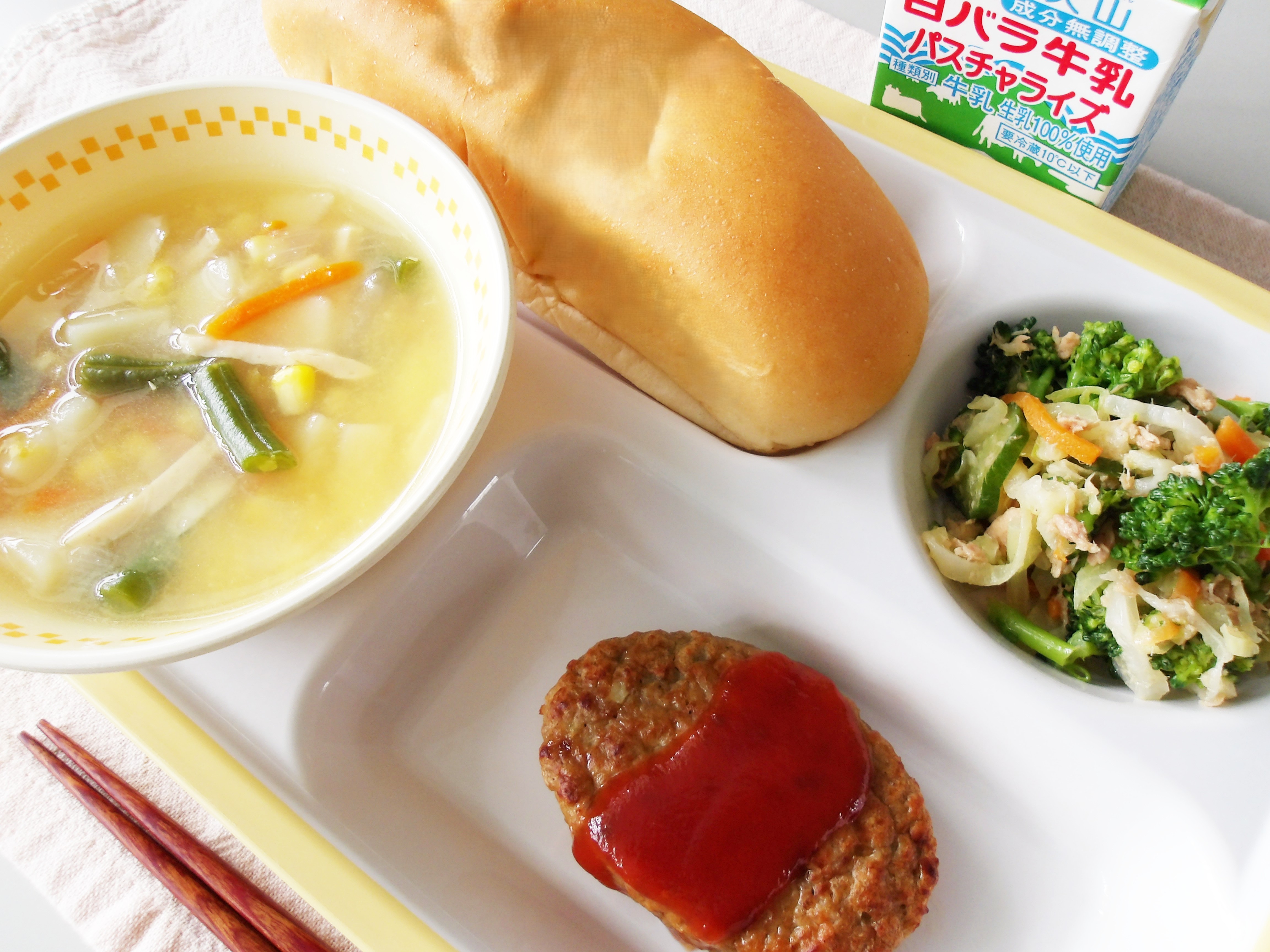 本場アメリカでは白いんげん豆を使うことが多いですが、学校給食では大豆を使います。大豆には体をつくるもとになるたんぱく質がたっぷりで、成長期の子どもたちにぴったりのメニューです。